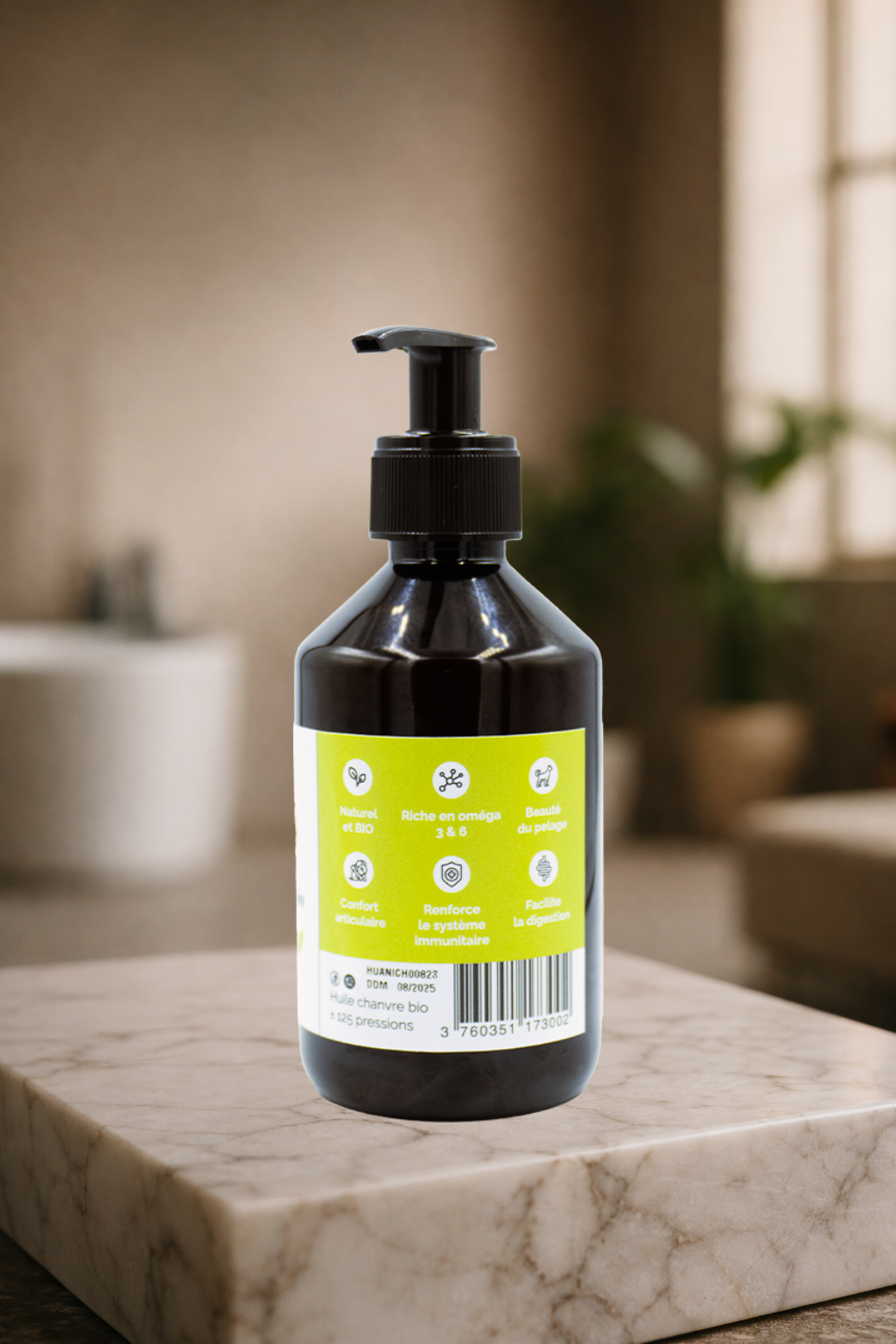 L’huile de chanvre BIO est un super-aliment parfait pour les chiens et les chats. Conditionnée en 250 ml et 500 ml avec pompe doseuse, elle est simple à ajouter à la ration de votre animal au quotidien. Naturellement riche en oméga-3, elle contribue au bien-être général, notamment au confort digestif et au soutien du système immunitaire. Cette huile est 100% naturelle, origine UE et BIO. Elle ne contient aucun cannabinoïde : uniquement de l’huile de graines de chanvre (THC 0%).